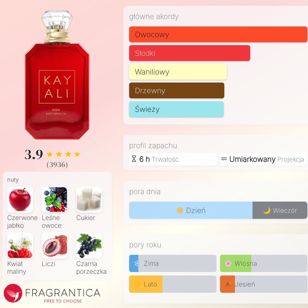 Zanurz się w zapachu, który jest jak pierwszy kęs chrupiącego, słodkiego jabłka – orzeźwiający, kuszący i pełen energii! Kayali Eden Juicy Apple | 01 to perfumy stworzone dla kobiet, które kochają zabawę, spontaniczność i młodzieńczą radość życia.