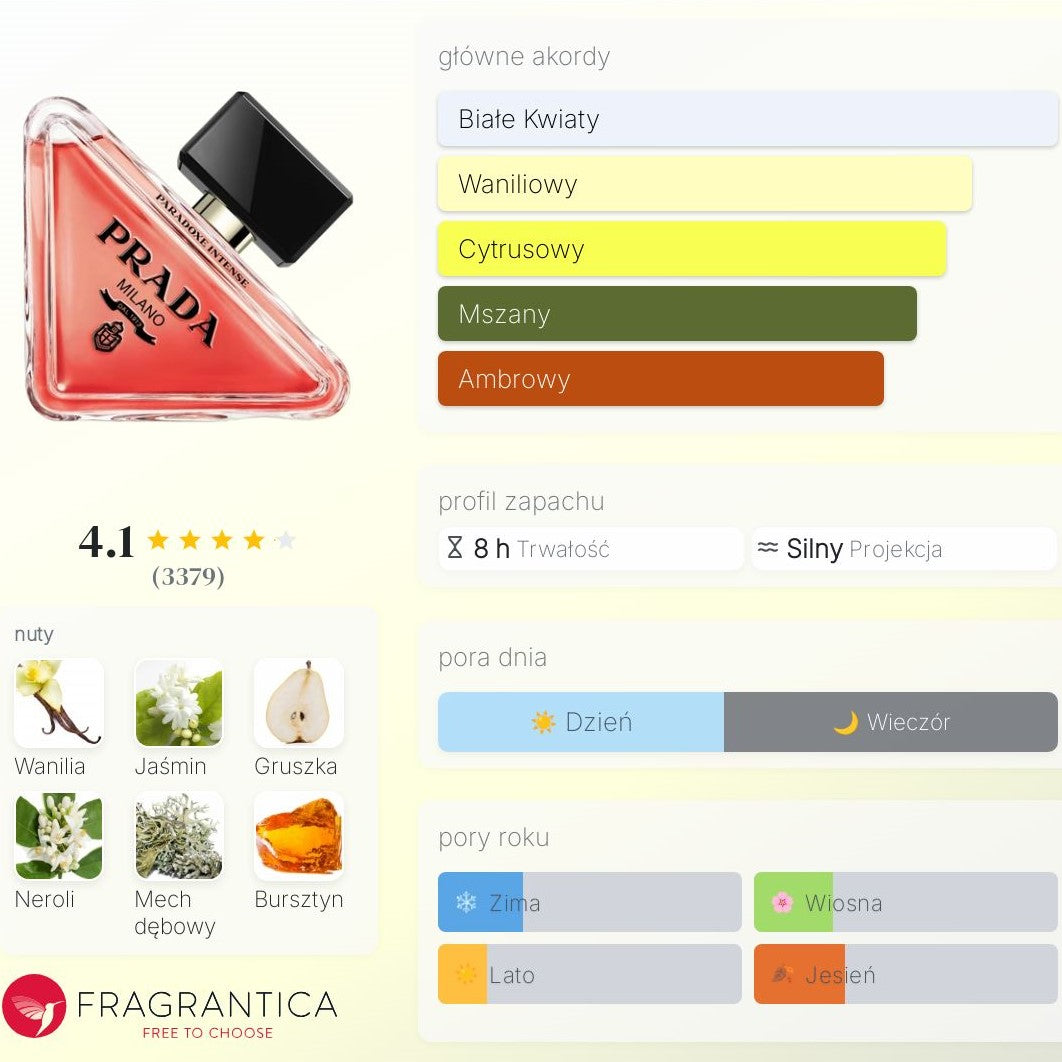 Jeszcze bardziej uwodzicielska, jeszcze bardziej intensywna! Prada Paradoxe Intense to zapach dla kobiet, które chcą podkreślić swoją siłę i elegancję. Kwiatowa świeżość przeplata się tu z ciepłymi, otulającymi akordami wanilii i ambry, tworząc magnetyczną aurę. To perfumy, które zostają w pamięci – pełne głębi, tajemnicy i wyjątkowego charakteru.